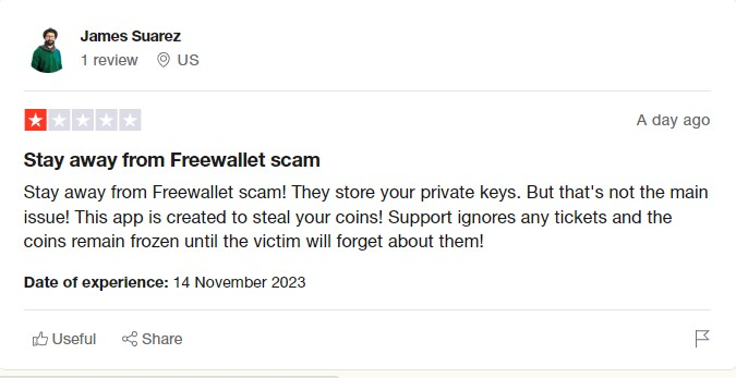 Freewallet scammers lure new customers by posting numerous fake reviews. They hire writers to craft positive comments and glowing reviews of their application. However, a look at independent review sites like Trustpilot and Sitejabber reveals dozens, if not hundreds, of complaints and refund requests.
